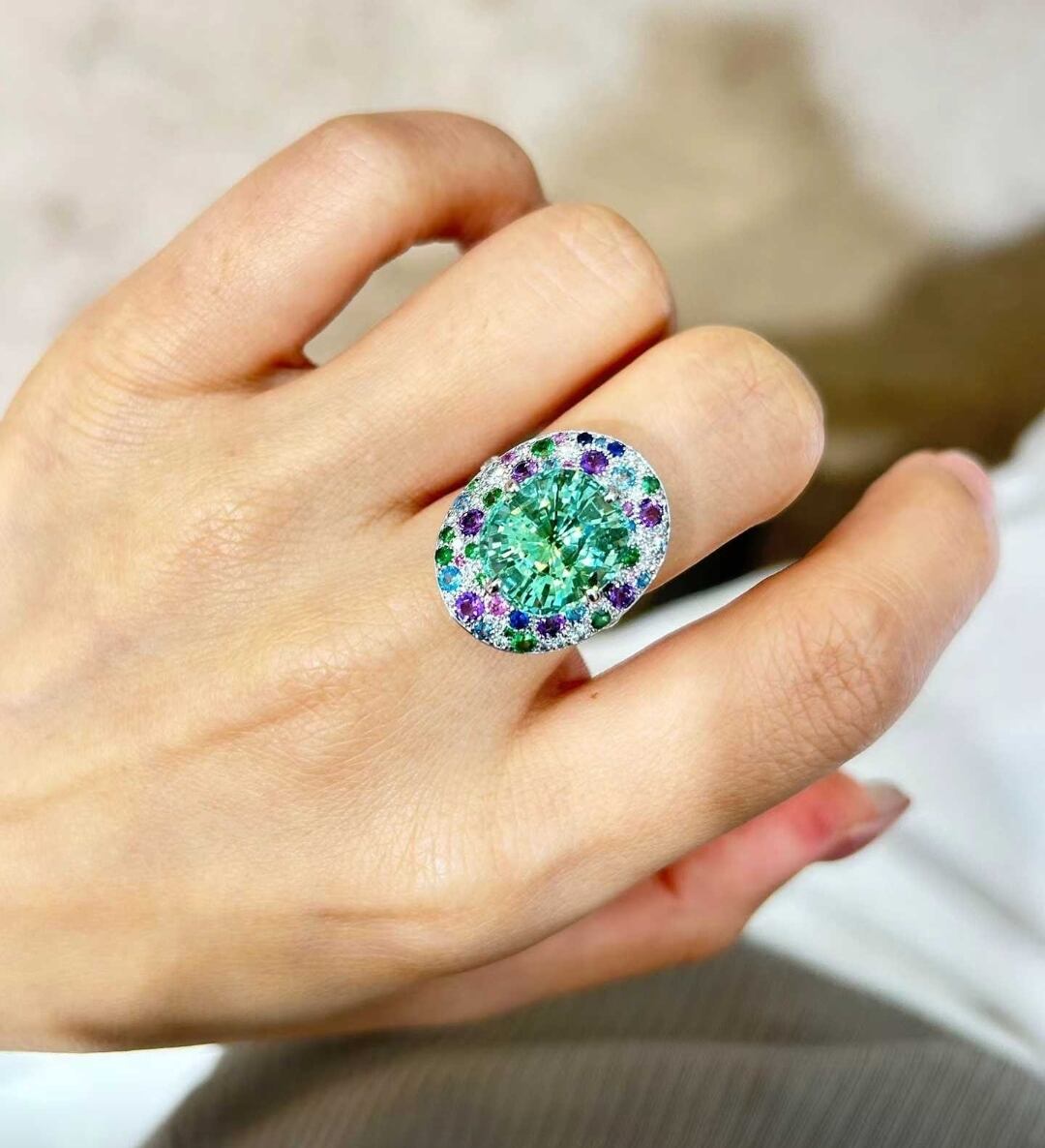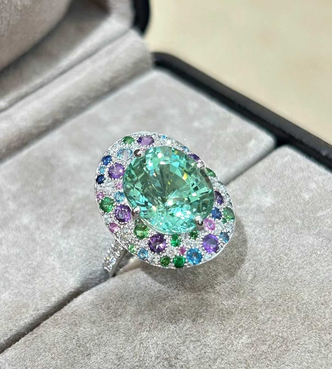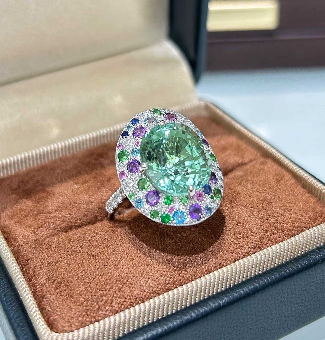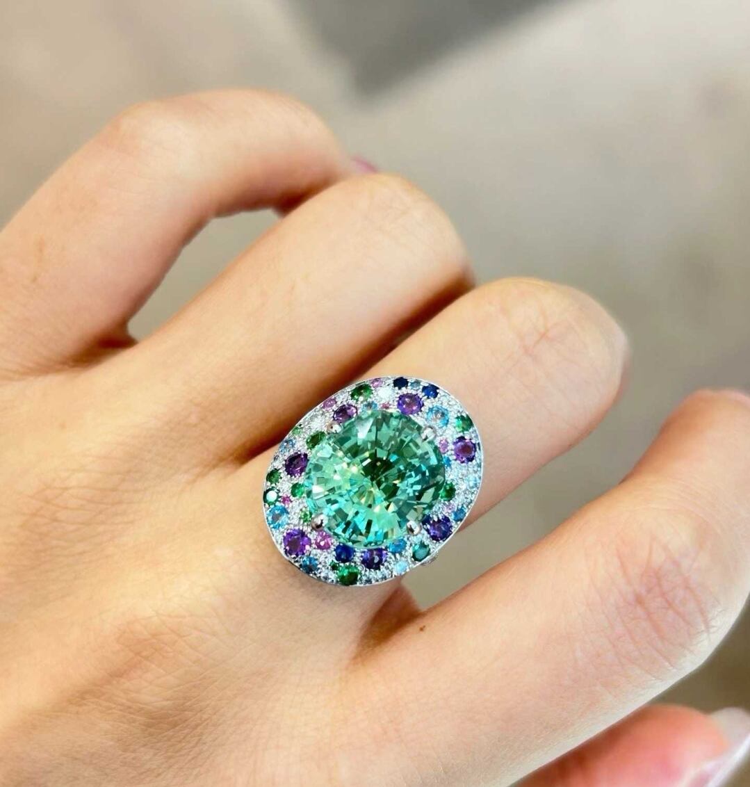 息をのむほど美しいラグーンカラーの輝きを宿した、アフガニスタン産ラグーンカラートルマリンを主役にしたラグジュアリーリング。