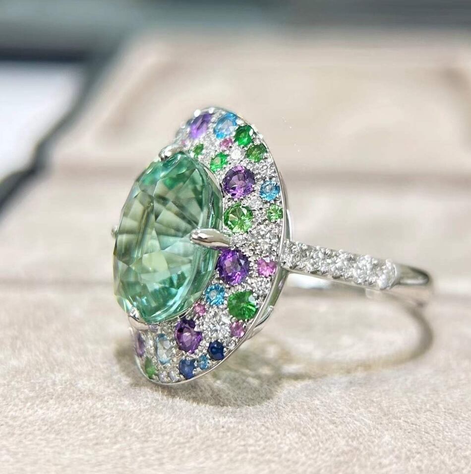 ホワイトゴールドの上質な輝きが、センターストーンのグリーンをより瑞々しく引き立て、指元に圧倒的な存在感をもたらします。