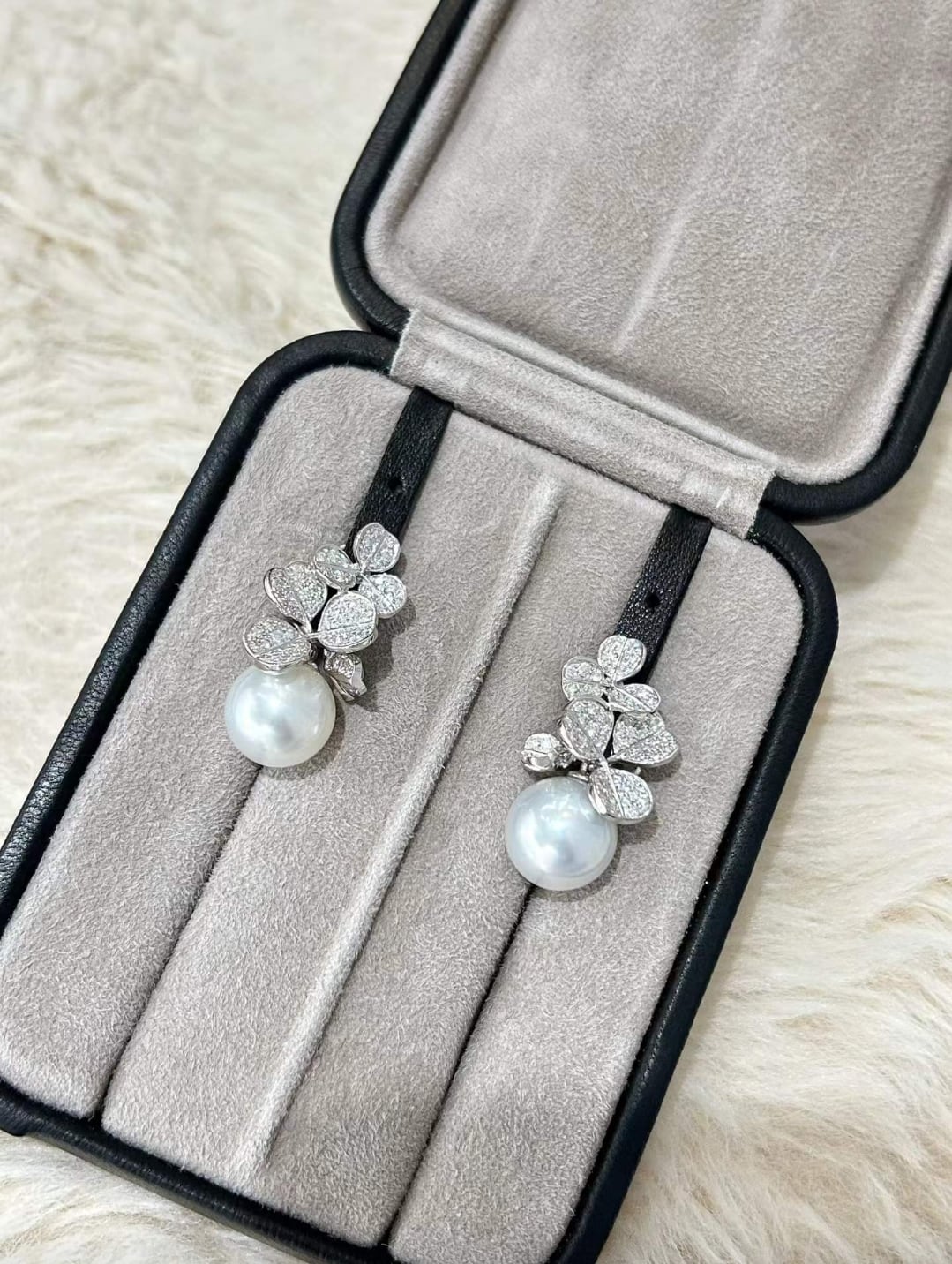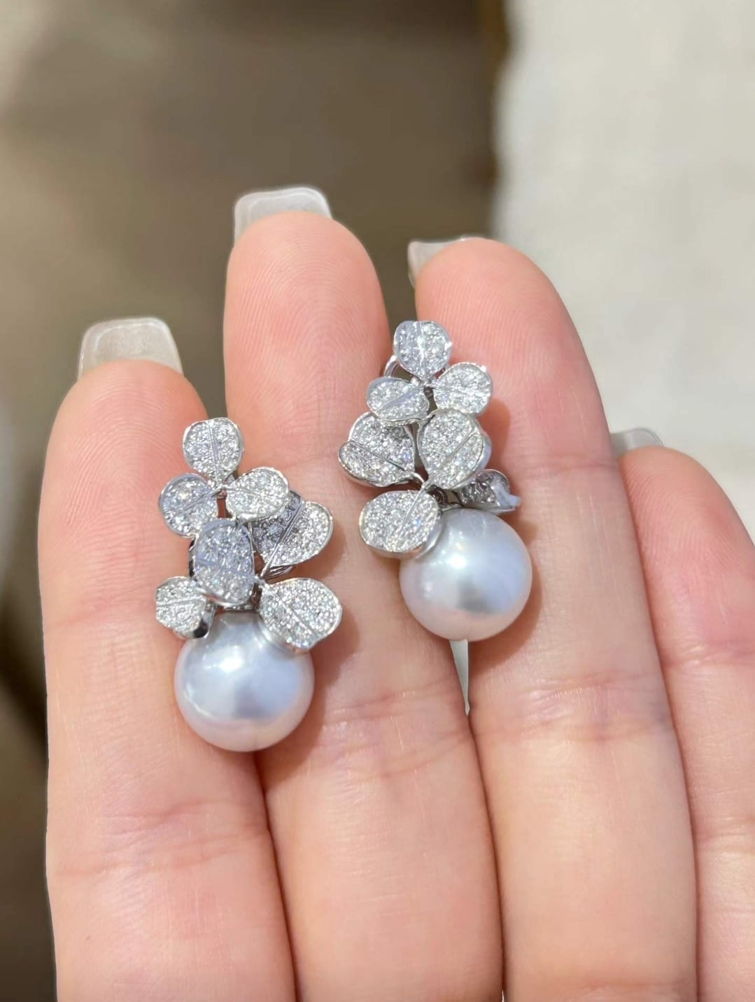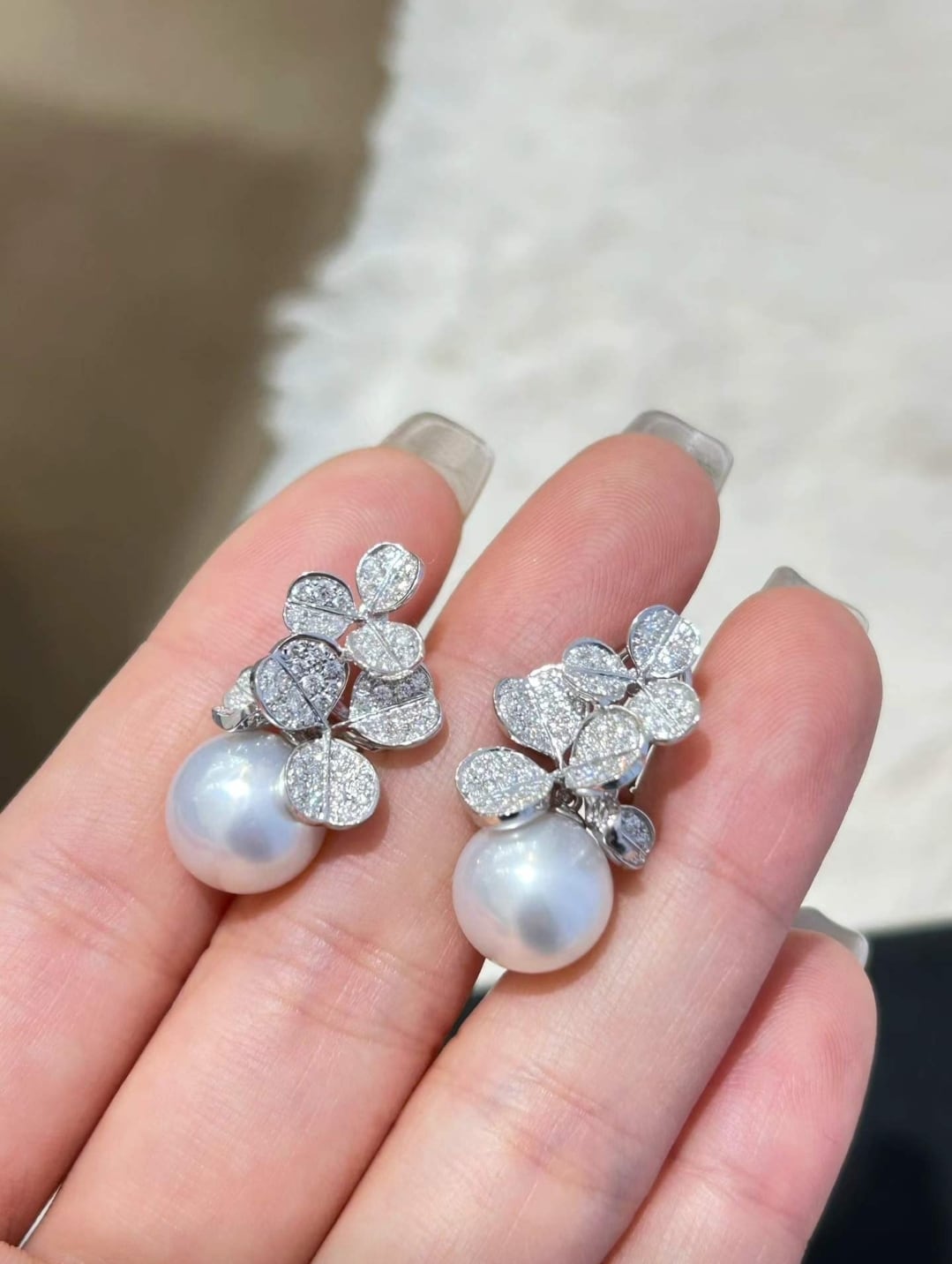 上質な11.6mmオーストラリア産ホワイトパールを主役に、繊細な三つ葉(クローバー)モチーフで仕立てたラグジュアリーピアス。