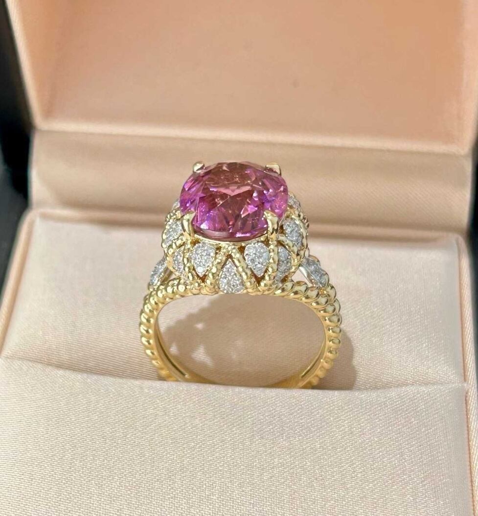 深みのあるパープルカラーが魅力のトルマリンは、光を受けるたびに瑞々しい輝きを放ち、指元に気品と個性を添えます。周囲には合計0.535ctのダイヤモンドを贅沢にセッティング。繊細なきらめきがセンターストーンを引き立て、上品な華やかさを演出します。