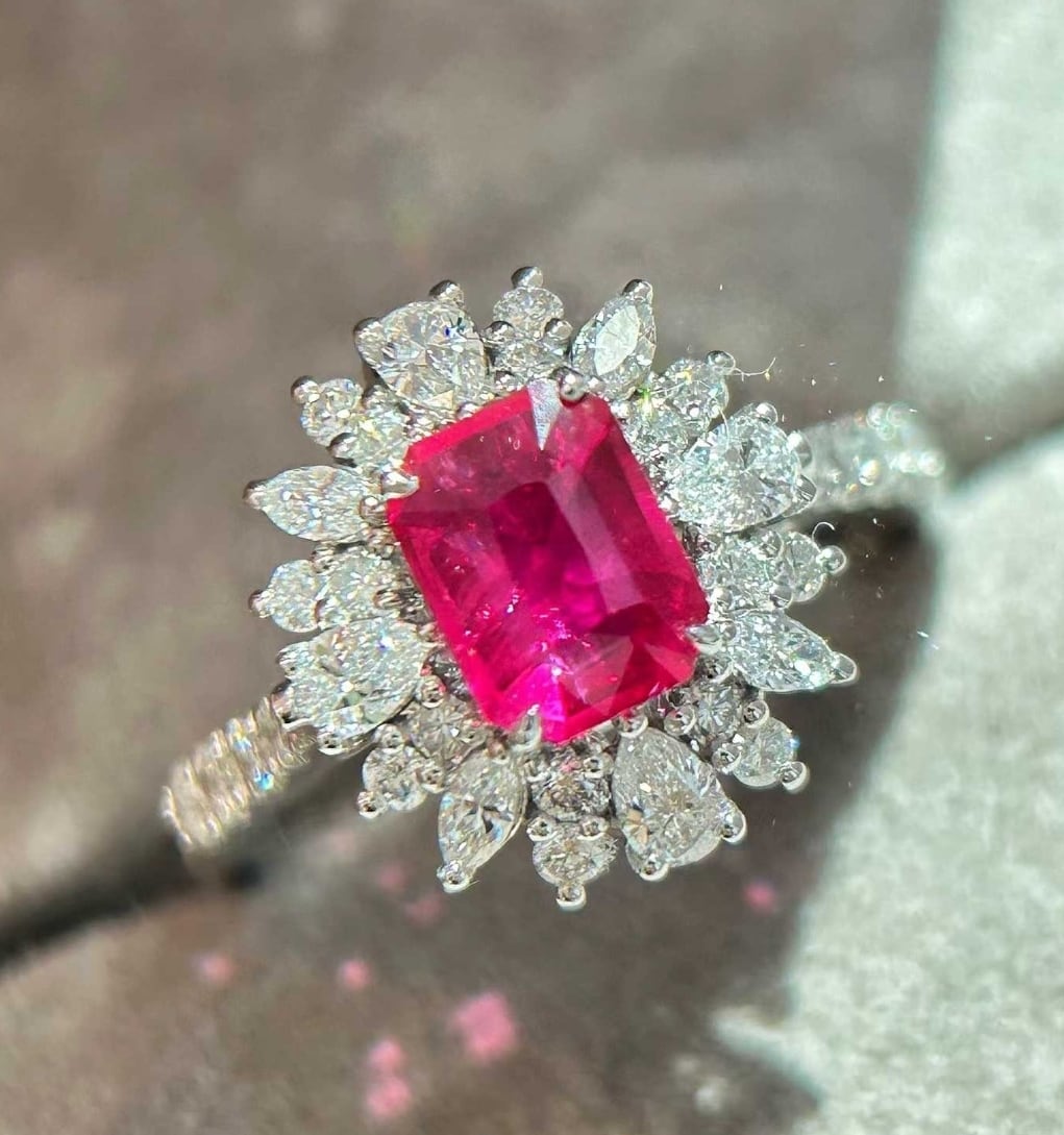 情熱的な赤が美しく輝く、希少なピジョンブラッドルビーをセンターにセットしたラグジュアリージュエリー。